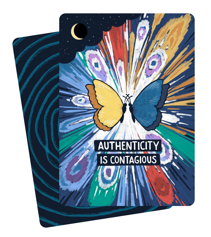 Let’s begin with a visual. Here’s the artwork for the “Authenticity is contagious” card for my upcoming “Find Your Own Way” oracle deck.