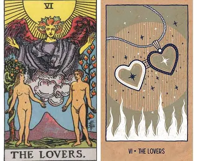 Left: The Lovers from the Rider–Waite tarot deck. Right: The Lovers from the Transient Light Tarot deck.